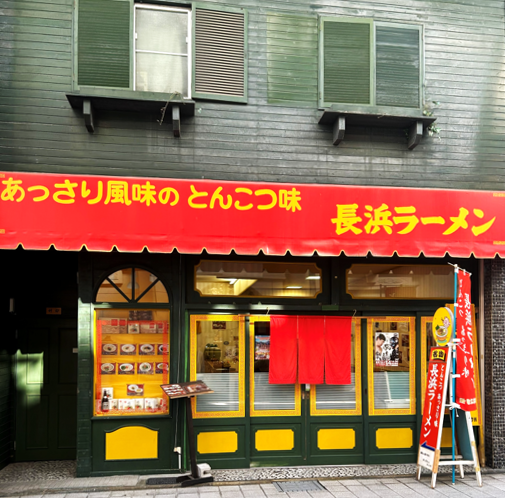 赤い看板と、緑のドアと黄色のフチが目をひく長浜ラーメンさん。