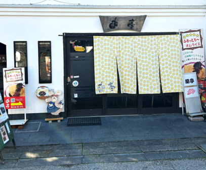 白壁に黒の出入り口。蘭亭の看板と共に目をひくのが、卵柄の大きな暖簾。