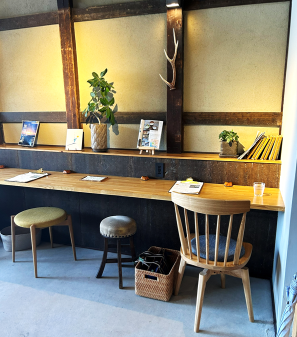 お店は、築150年の町家を丁寧に改装した空間。テイクアウトカウンターの奥には、訪れた人が自由に寛げる「居心地の良いリビング」が広がっています。