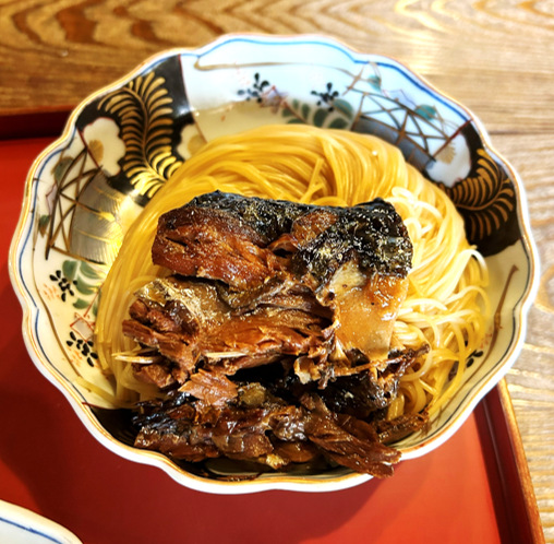 そうめん。温かく提供されるそうめんは、鯖を煮込んだ特製の甘辛い煮汁をたっぷりと吸い込んでいます。